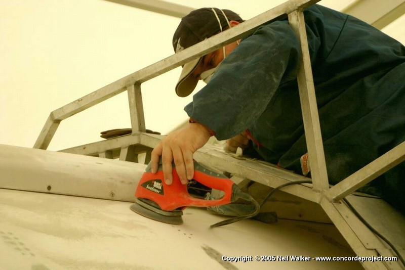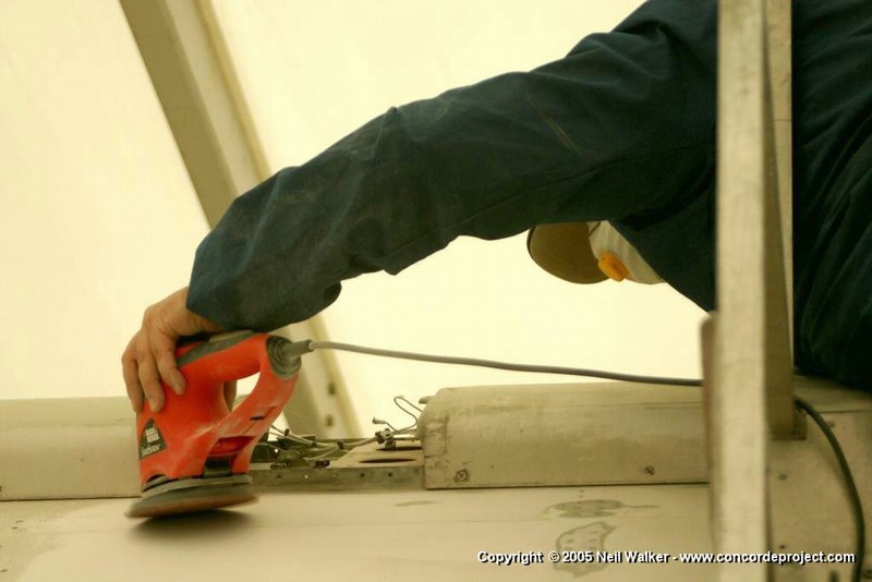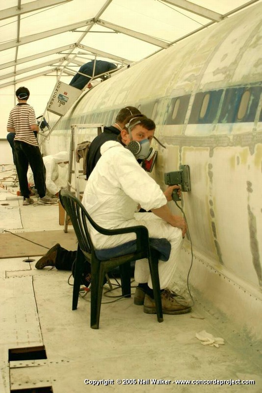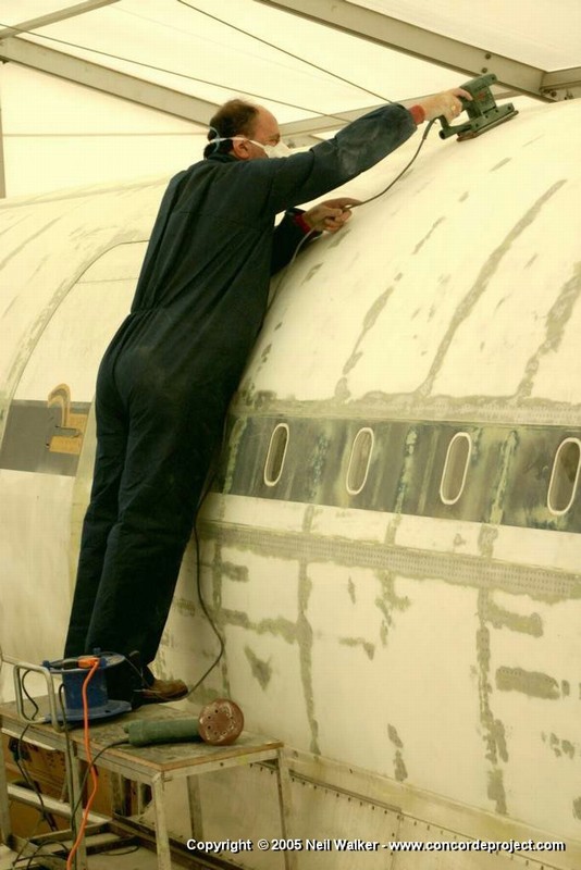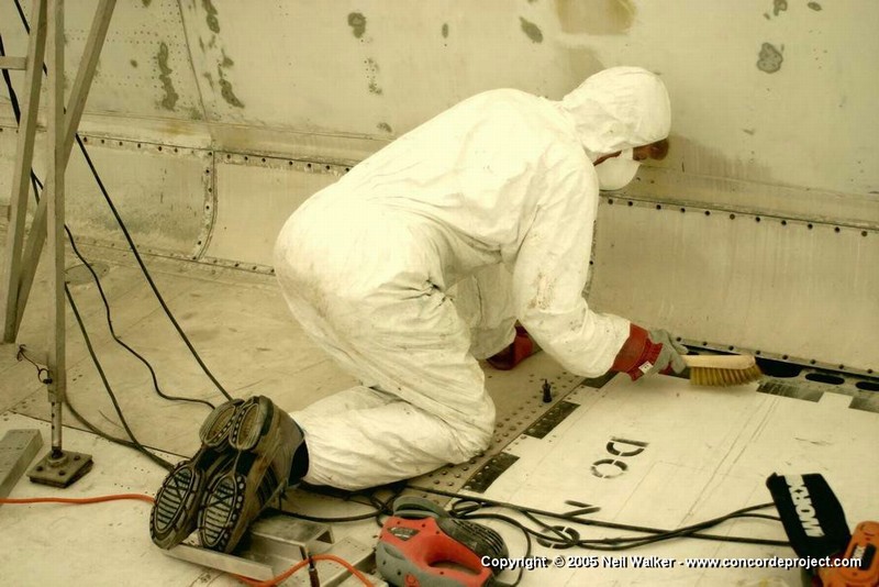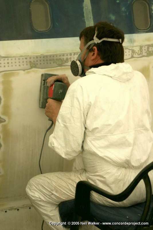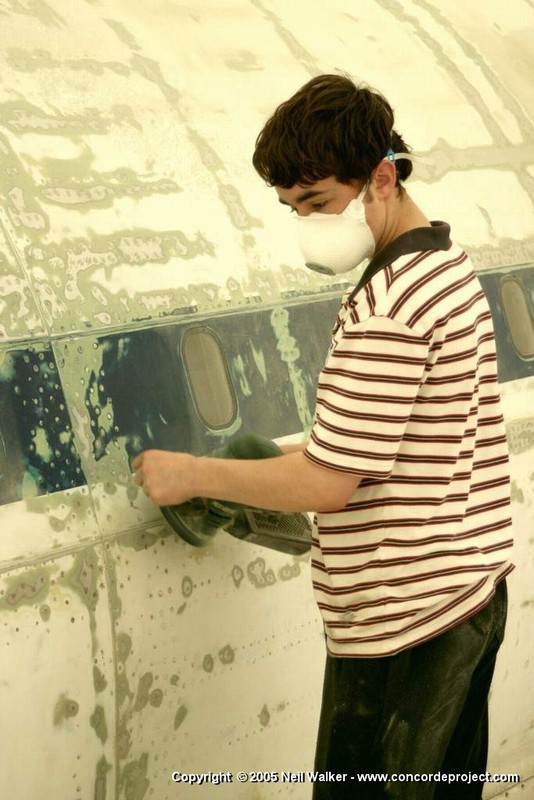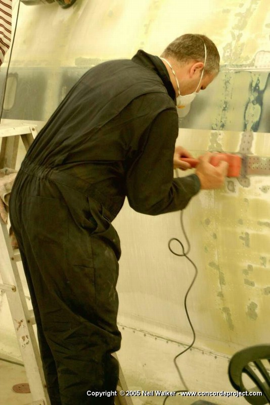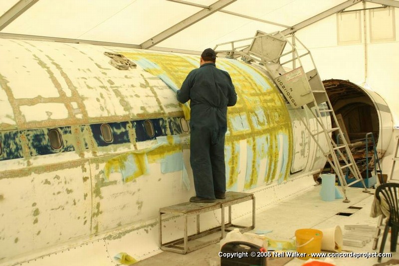 Sanding the centre fuselage and applying Alochrom (a corrosion-resistant protective coating for aluminium).