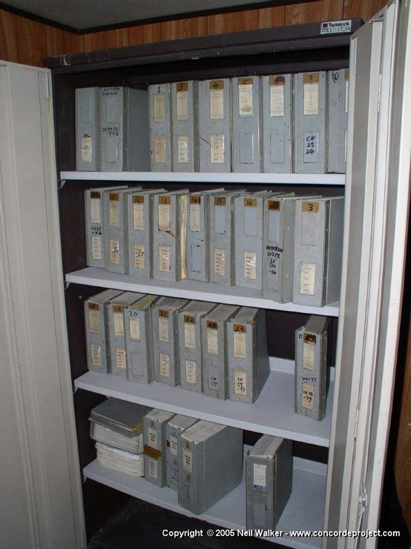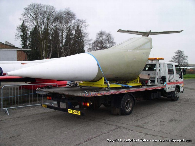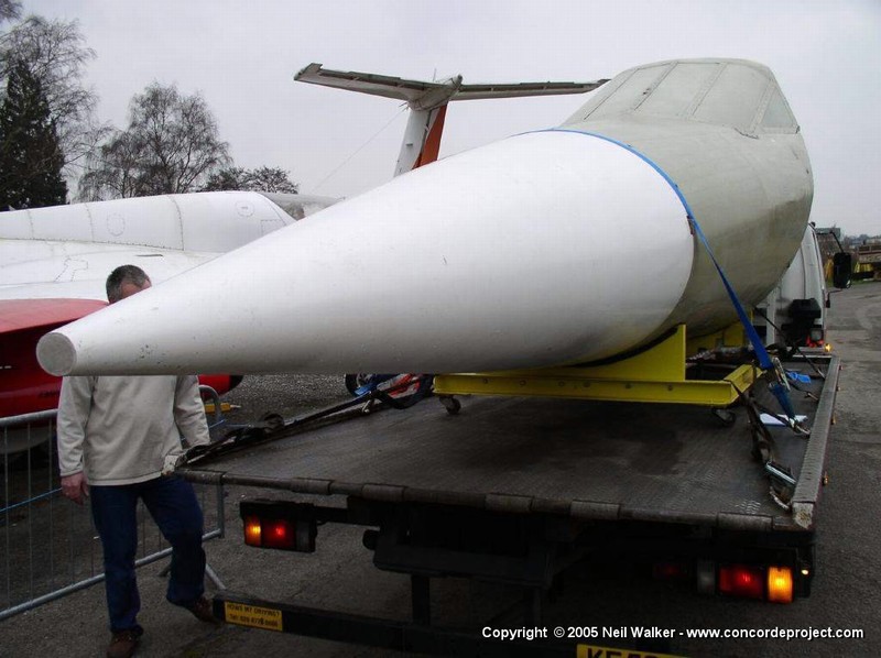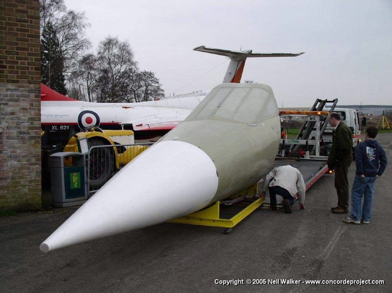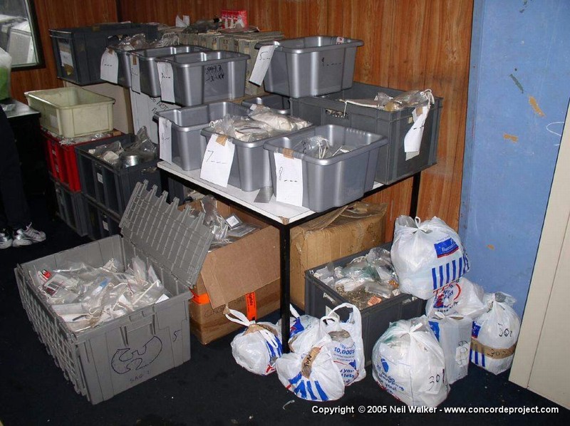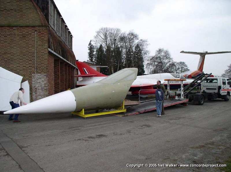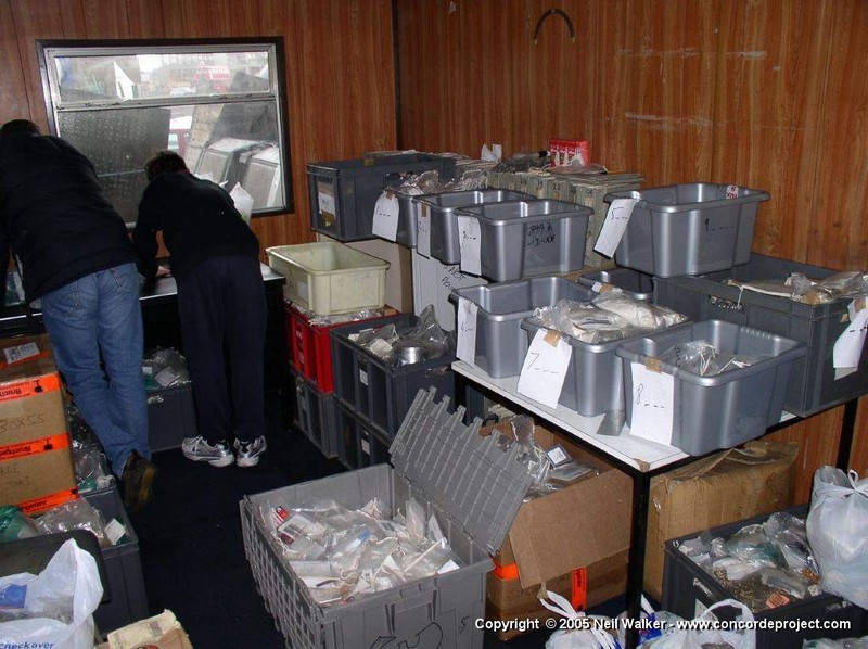 Sorting some of the many boxes of Concorde fittings. The recently sold ex-fatigue airframe nose departs to its new home.