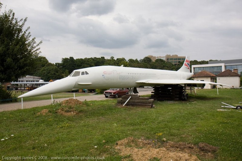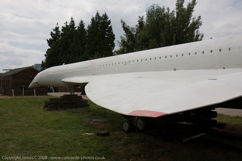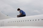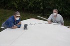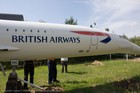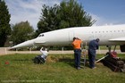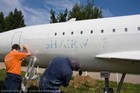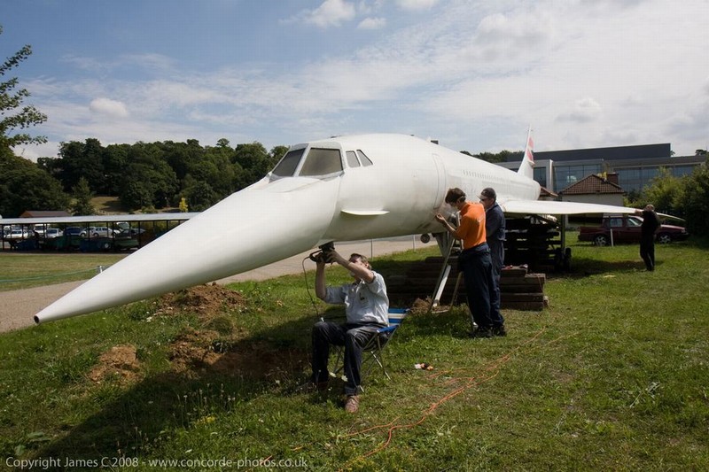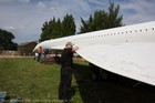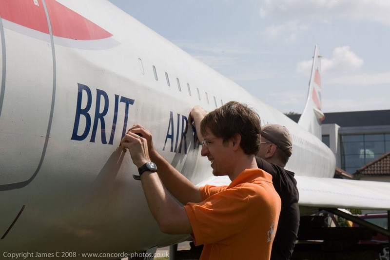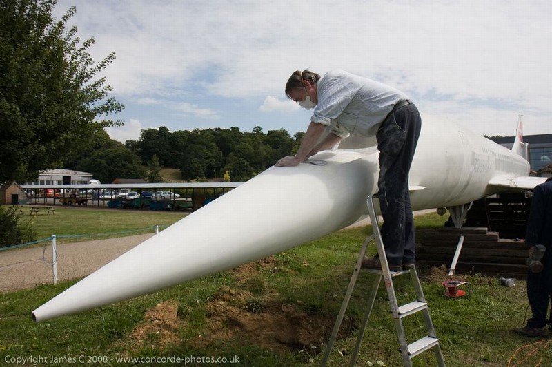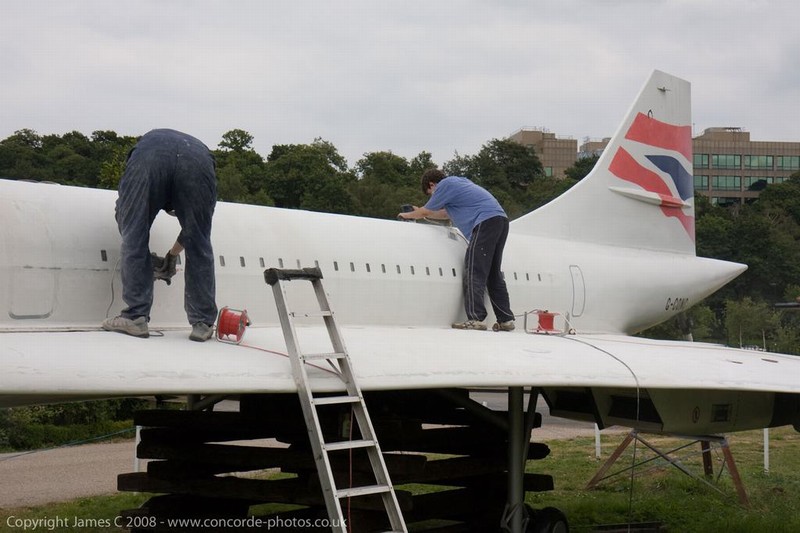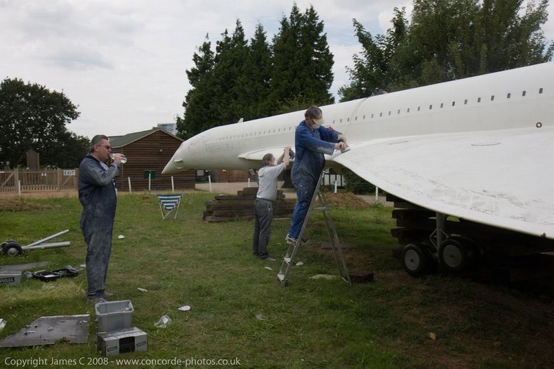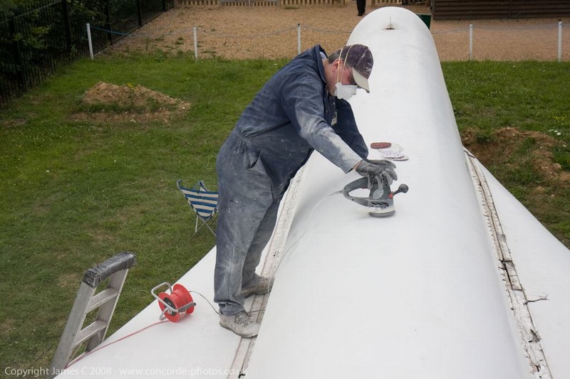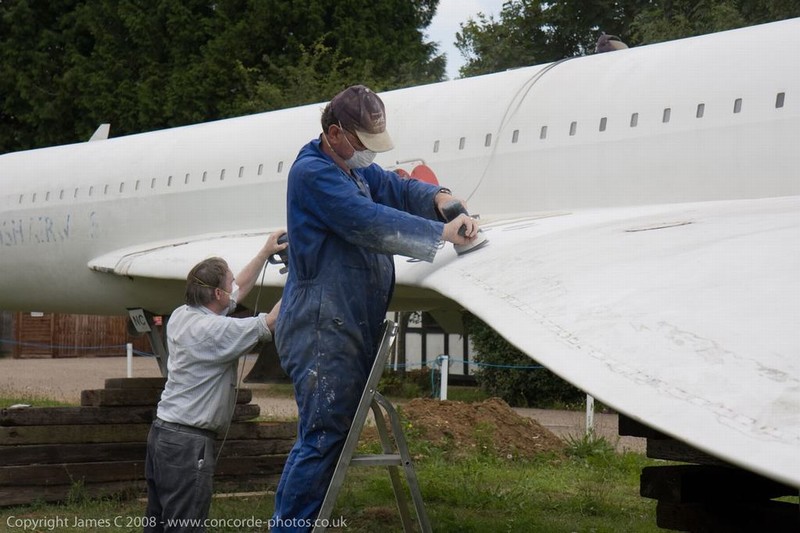 Volunteers sanding G-CONC's fuselage and wings.