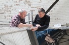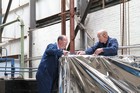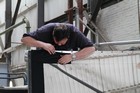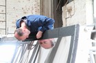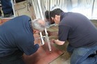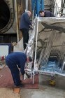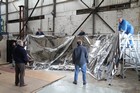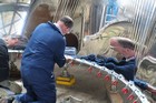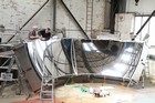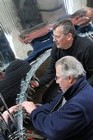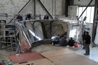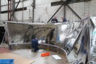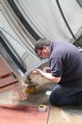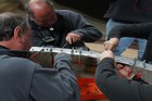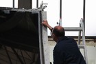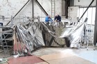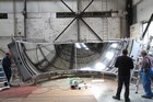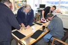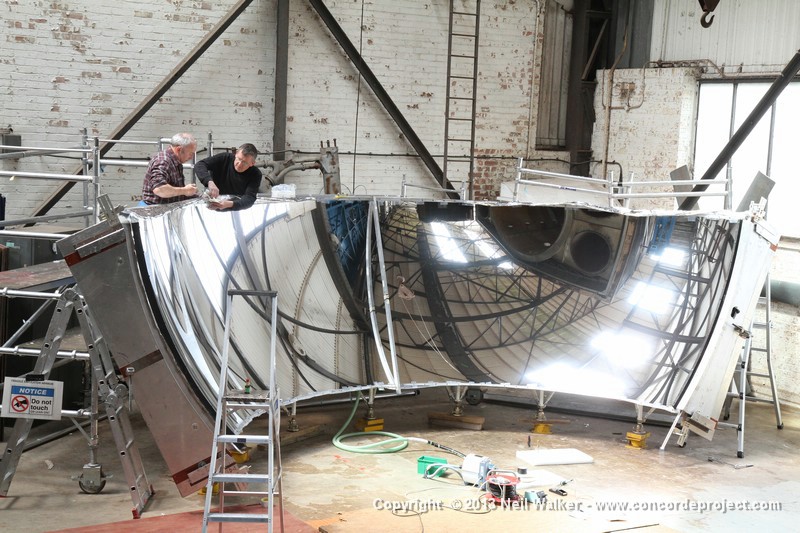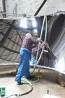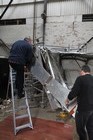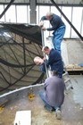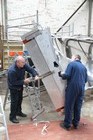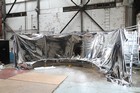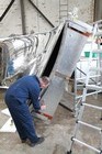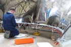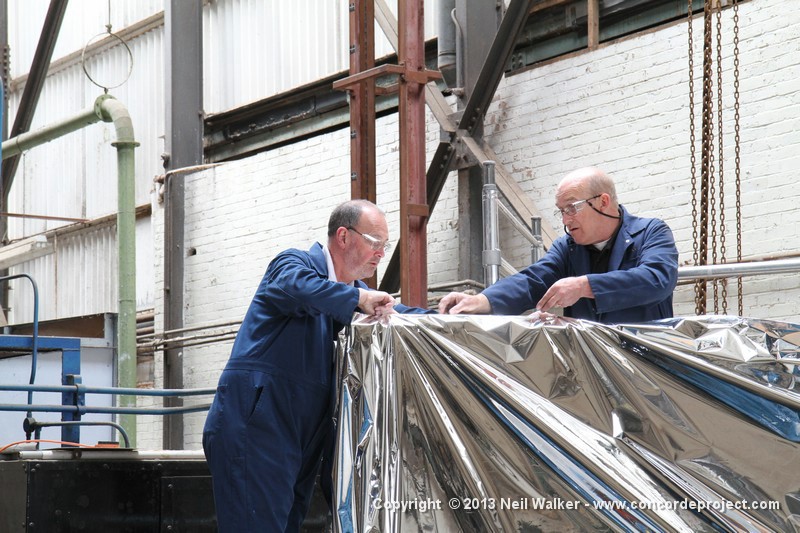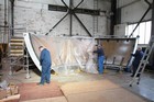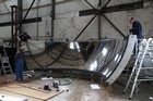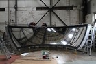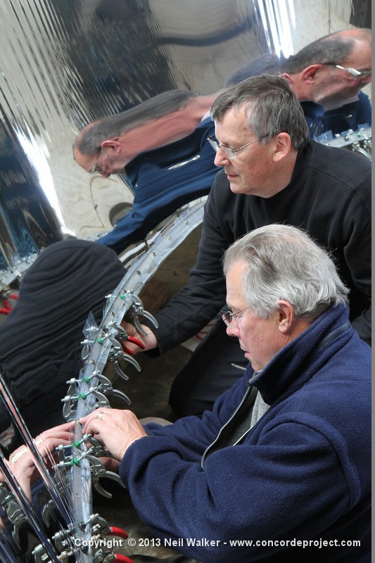 Volunteers from Thales, with help from museum volunteers, reskin the simulator mirror. This consists of a mylar film rather than glass.